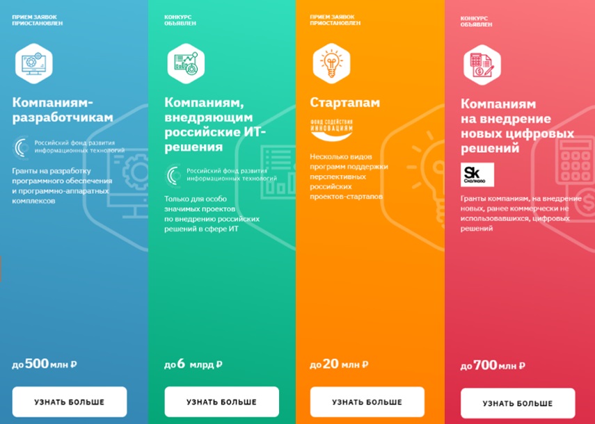 Разные программы грантовой поддержки рассчитаны на разные категории получателей — от ИТ‑стартапов до крупных компаний, разрабатывающих или внедряющих отечественные ИТ‑решения.