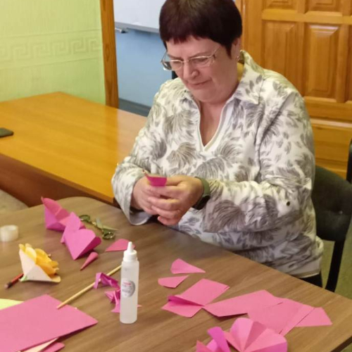 Ведущая данного мероприятия Наталья Прокопьевна Дубень познакомила участников с техниками создания цветов из различных материалов. Женщины вырезали, клеили, подбирали цвета и формы для цветов из бумаги.