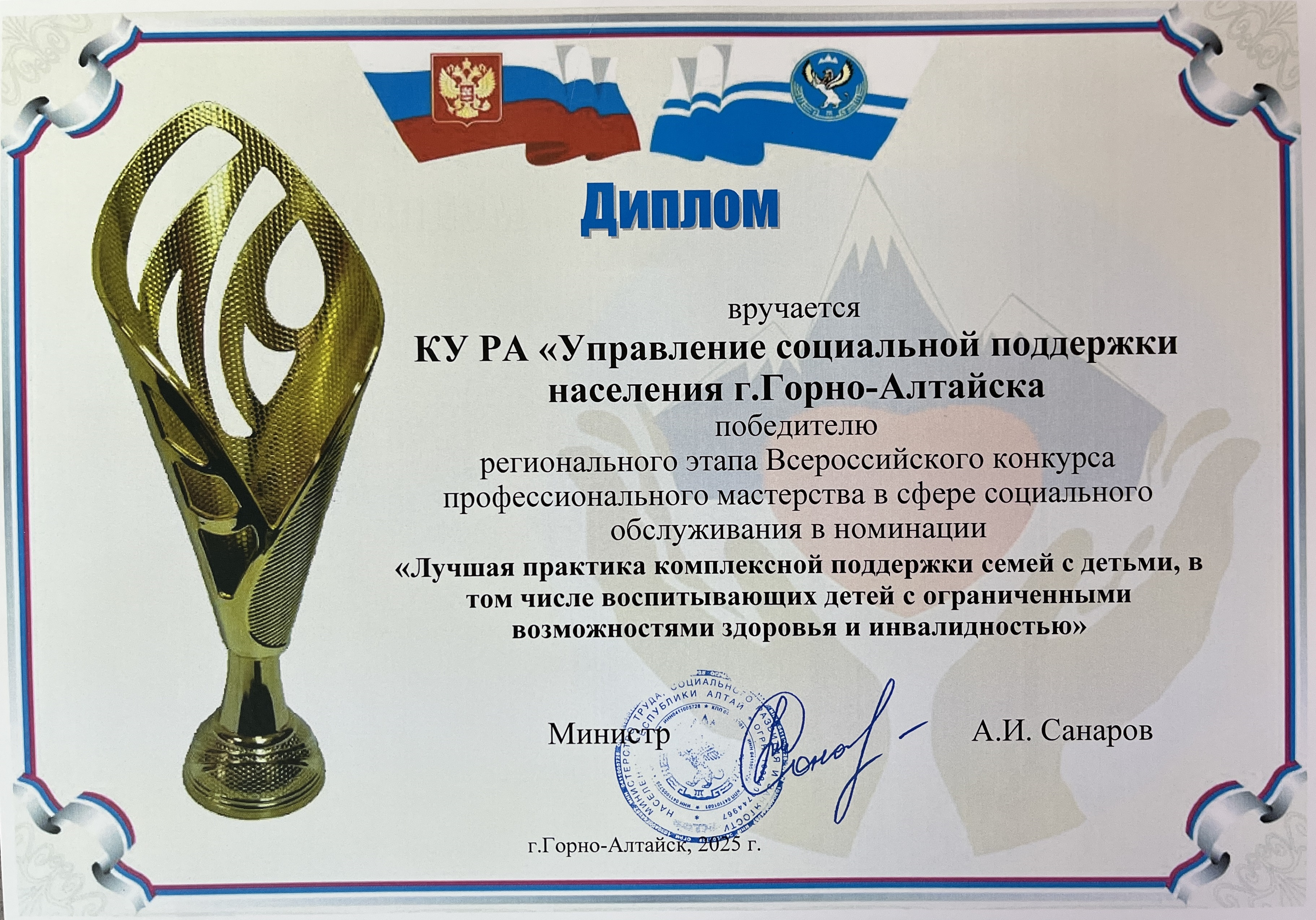 Управление социальной поддержки населения города Горно-Алтайска признано победителем регионального этапа Всероссийского конкурса профессионального мастерства в сфере социального обслуживания в номинации «Лучшая практика комплексной поддержки семей с детьми, в том числе воспитывающих детей с ограниченными возможностями здоровья и инвалидностью» с вручением диплома.