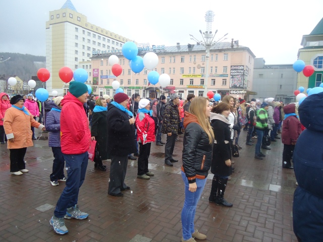 Исполненная вначале песня «Катюша» подняла всем настроение, а веселый танец под хит группы «Любэ»  - «Рассея, моя Рассея» - объединил собравшихся в одно целое. В заключение молодые люди, взявшись за руки, сделали большой круг, центром которого стали ветераны с разноцветными воздушными шарами. По команде ведущего  шары были выпущены в небо, при этом молодежь непрерывно аплодировала людям старшего возраста. Этот флэш-моб под девизом: «Время требует действий!» - в очередной раз показал тесную связь поколений и похожесть людей разных возрастов.