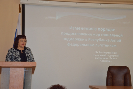 Татьяна Викторовна познакомила ветеранов с последними изменениями в законодательстве. Она подробно объяснила, что с 10 сентября 2016 года при расчете мер социальной поддержки на оплату жилищно-коммунальных услуг федеральным льготникам будут применяться нормативы потребления коммунальных услуг, установленные уполномоченным исполнительным органом государственной власти Республики Алтай в сфере государственного регулирования тарифов (цен) – Комитетом по тарифам Республики Алтай.