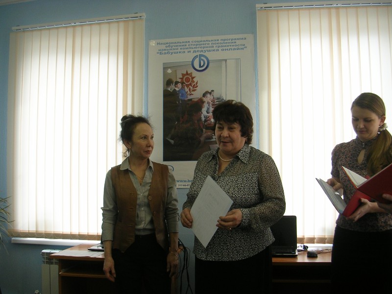 19 марта 2014г. состоялось торжественное вручение дипломов выпускникам первой группы компьютерных курсов для пожилых людей 10 человек в возрасте от 63 до 77 первыми освоили компьютер и сеть Интернет в рамках социальной национальной программы «Бабушка и дедушка онлайн». За время занятий они познакомились с устройством ноутбука, освоили текстовые редакторы, получили навыки работы в социальных сетях, в поисковых системах, на едином портале государственных услуг и другое.